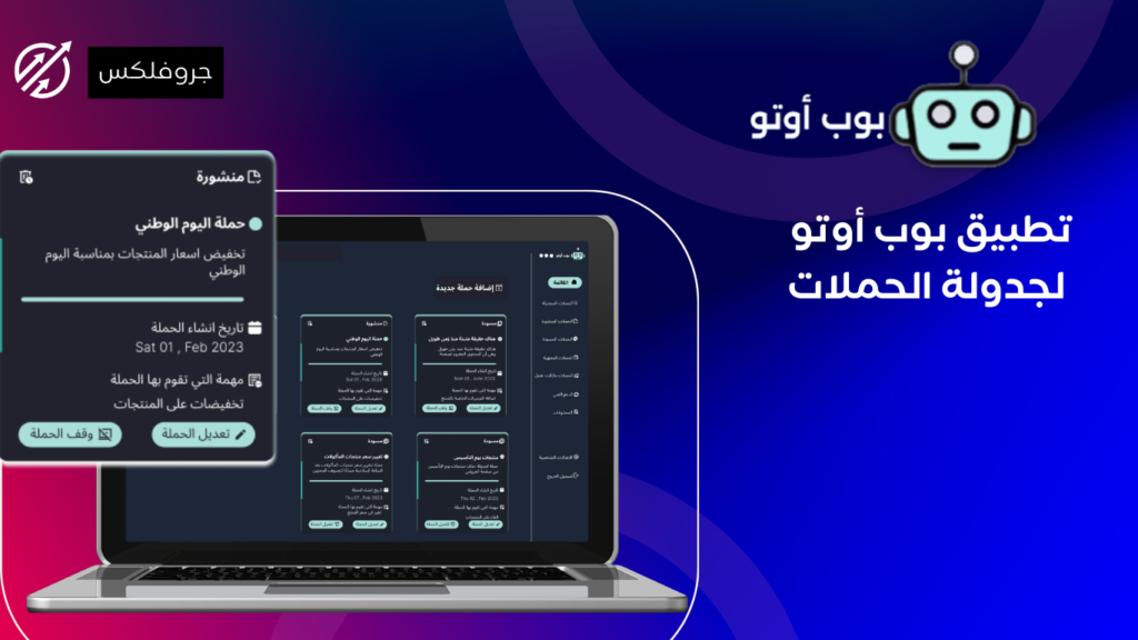 بوب أوتو، أتمت مهام متجرك بكل سهولة! تبغى تجدول العروض والتخفيضات، أو تنشر وتخفي المنتجات، وتضيفها لقسم العروض؟ بوب أوتو يتولى كل هالأمور عنك! اشترك، حدد المهمة والجدول، والباقي عليه. مهام مثل نشر المنتجات، إخفائها، تحديث الأسعار، تطبيق أو حذف التخفيضات، وإضافة أو إزالة المنتجات من التصنيفات. منتجاتك كثيرة؟ لا تشيل هم، ارفع ملف إكسل، والنظام بيتعرف عليها ويطبق المهام تلقائيًا.